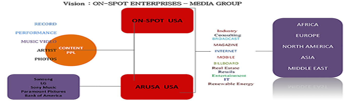 0N-SPOT ENTERPRISES LLC consists of these six media companies; the record label Arusa Music Entertainment LLC, the production company Leon Entertainment LLC, the Advertising company, On-Spot Billboard Inc., and the publishing company ME/ME2 Magazine LLC. On-Spot Enterprises was established in 2001. It was able to succeed in a relatively short period. Their headquarters are located in 242 SPARROW DRIVE GAINESVILLE VIRGINIA and incorporated under the law of the state of Virginia 1The media group has branch offices in New York, Washington DC, Los Angeles, and overseas in Montréal- Canada, Paris- France. On-Spot Enterprises is 79 full time employees and more than 30 part-time. Recently a branch office was established in and Japan and South Korea in order to handle the Asian market as well as to promote Asian artists in the US.
